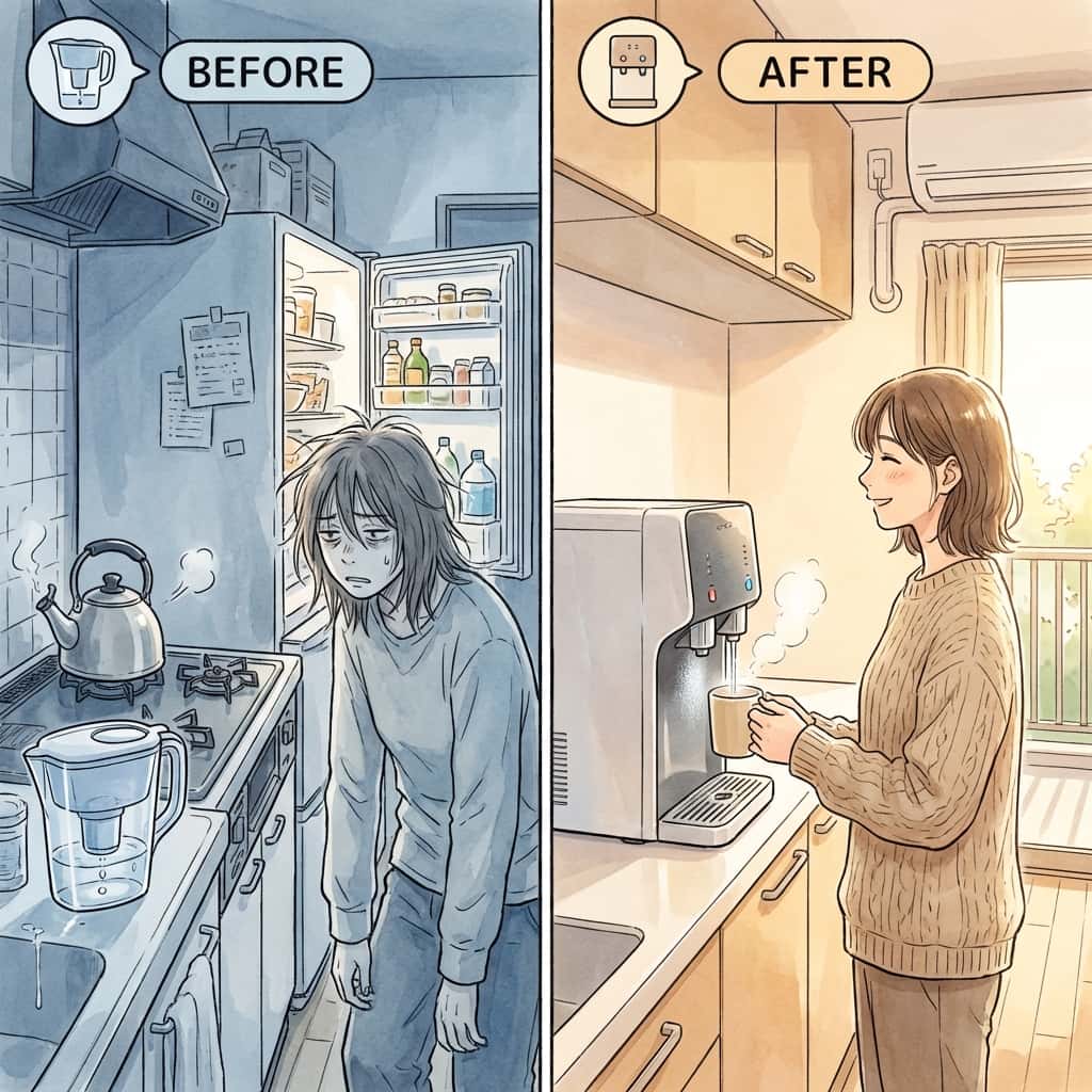 純粋なコストだけ見ると浄水器には負けますが、「冷水・温水が待たずに使える」という便利さは一度体験すると手放せなくなります。
