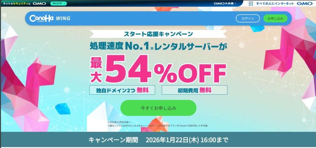 独自ドメインが2つ永久無料になる特典がついているため、長期的にブログを運営するならこれ一択です。