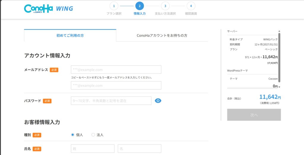 ステップ2:アカウント作成・お客様情報入力・SMS認証・決済
