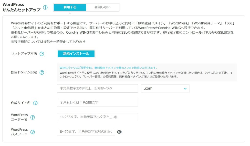 「WordPressかんたんセットアップ」を「利用する」を選択します。